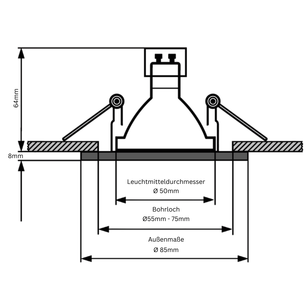 - Optimale Abmessungen: Der benötigte Einbaudurchmesser beträgt Ø 55mm - 75mm, während die Einbautiefe bei 64mm liegt, was eine einfache Integration in verschiedene Deckenarten ermöglicht.