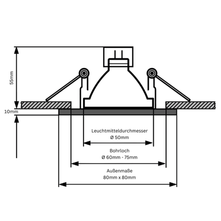 Um eine reibungslose Installation zu gewährleisten, weist der Einbaustrahler folgende wichtige Abmessungen auf: