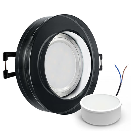 LED Aufbau Einbaustrahler schwarz spiegelnd rund Glas Lochmaß Ø 68mm - 75mm geringe Einbautiefe flach 230V
