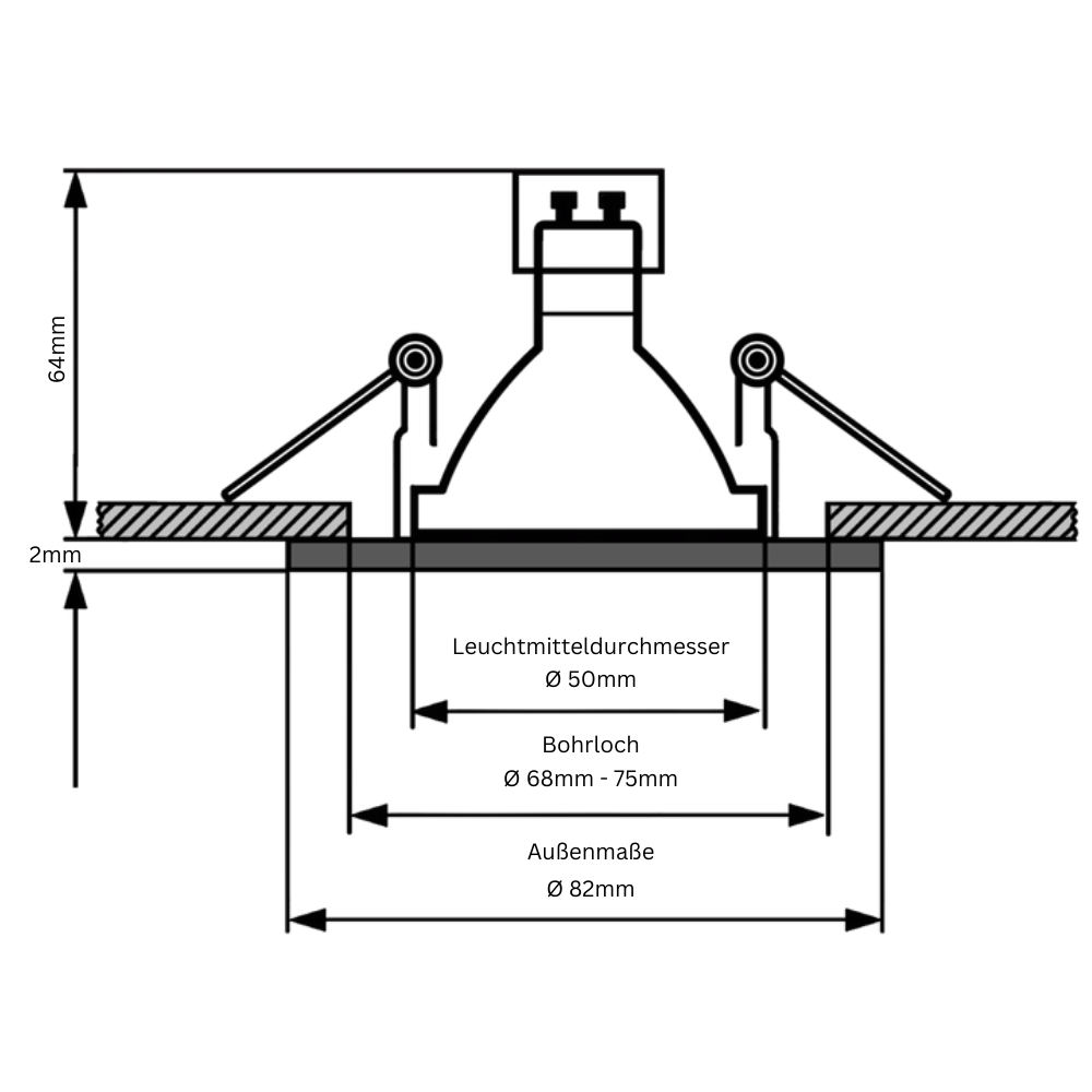 - Optimale Abmessungen: Der benötigte Einbaudurchmesser beträgt Ø 68mm - 75mm, während die Einbautiefe bei 64mm liegt, was eine einfache Integration in verschiedene Deckenarten ermöglicht.