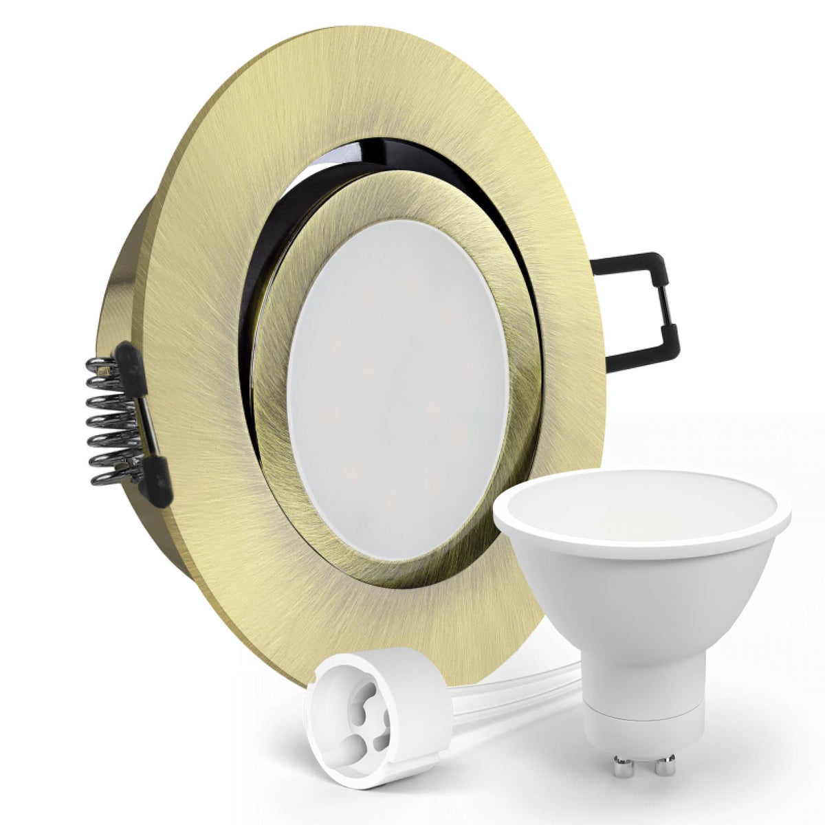 Als Set erhalten Sie den Einbaurahmen, eine GU10-230V-Fassung sowie ein Leuchtmittel (wenn ausgewählt).