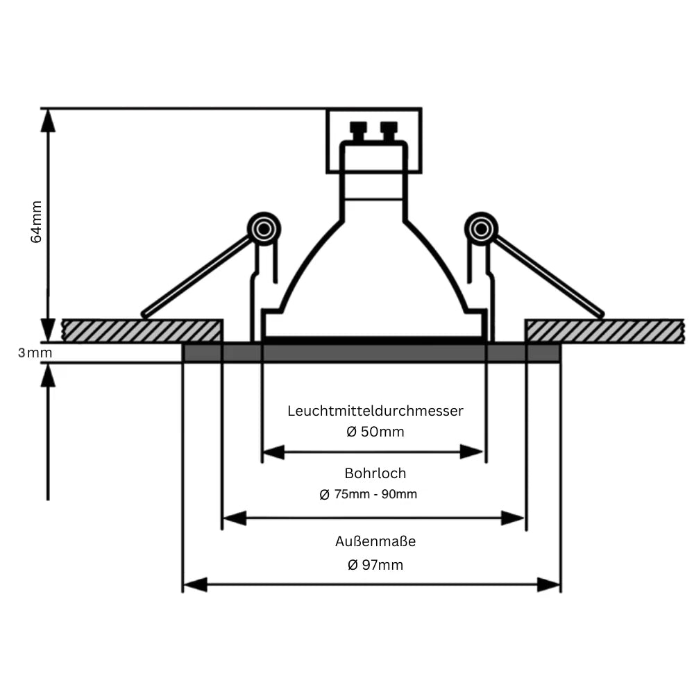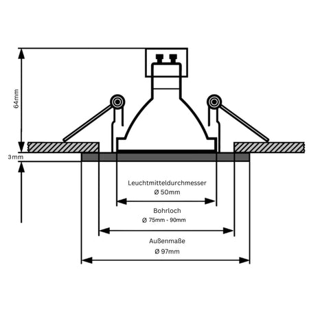 - Optimale Abmessungen: Der benötigte Einbaudurchmesser beträgt Ø 75mm - 90mm, während die Einbautiefe bei 64mm liegt, was eine einfache Integration in verschiedene Deckenarten ermöglicht.